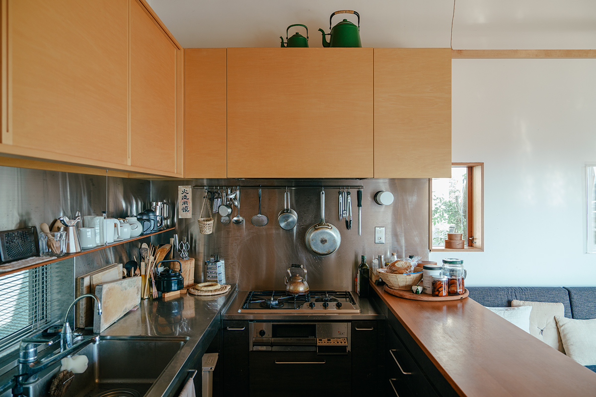 約4畳の台所。壁のステンレス張りや流し台前に設けたパンチングメタルの棚などに、料理人だった前オーナーの希望が反映されている