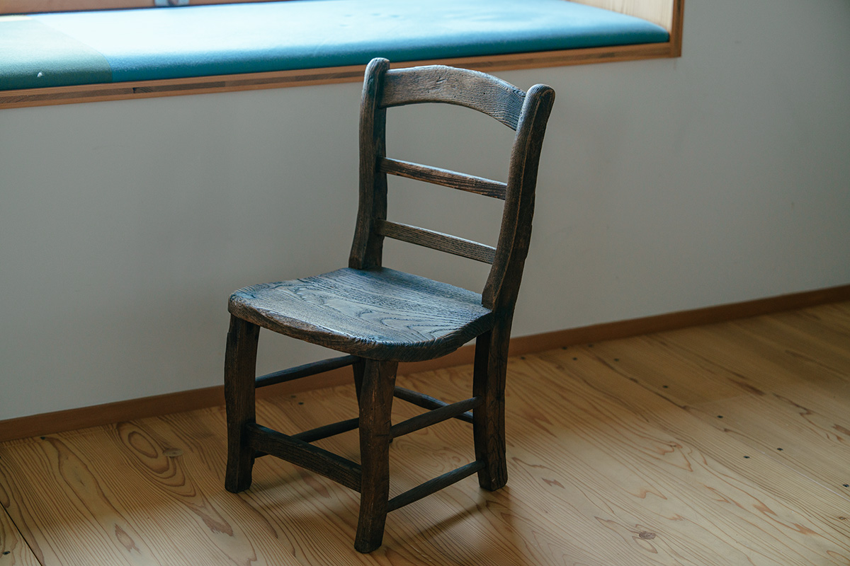 約160年前に幼稚園で使用されていた椅子。長い年月を経て栗の座板の木目が浮き上がり、えも言われぬ風合いを醸し出している