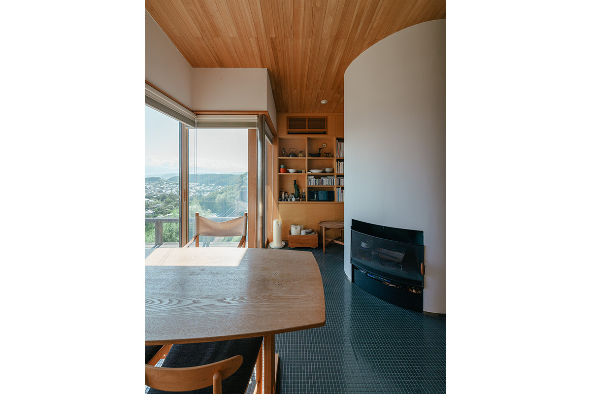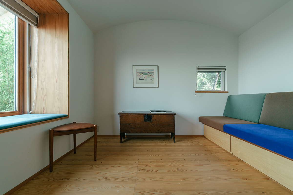 らせん階段を上り、跳ね上げ式の扉を押し上げると、鴨長明の方丈と同じ3m四方の隠れ家のような部屋が出現。出窓のあるワンルームにはベッドに早変わりするソファをしつらえてあり、来客用の寝室でもある。海を眺めるためにつくられた出窓から大空と眼下に広がる太平洋を望むことができる。景色を眺めたり、本を読んだり、心ゆくまで過ごせるように、出窓は座り心地のよいクッション仕上げにしてある。