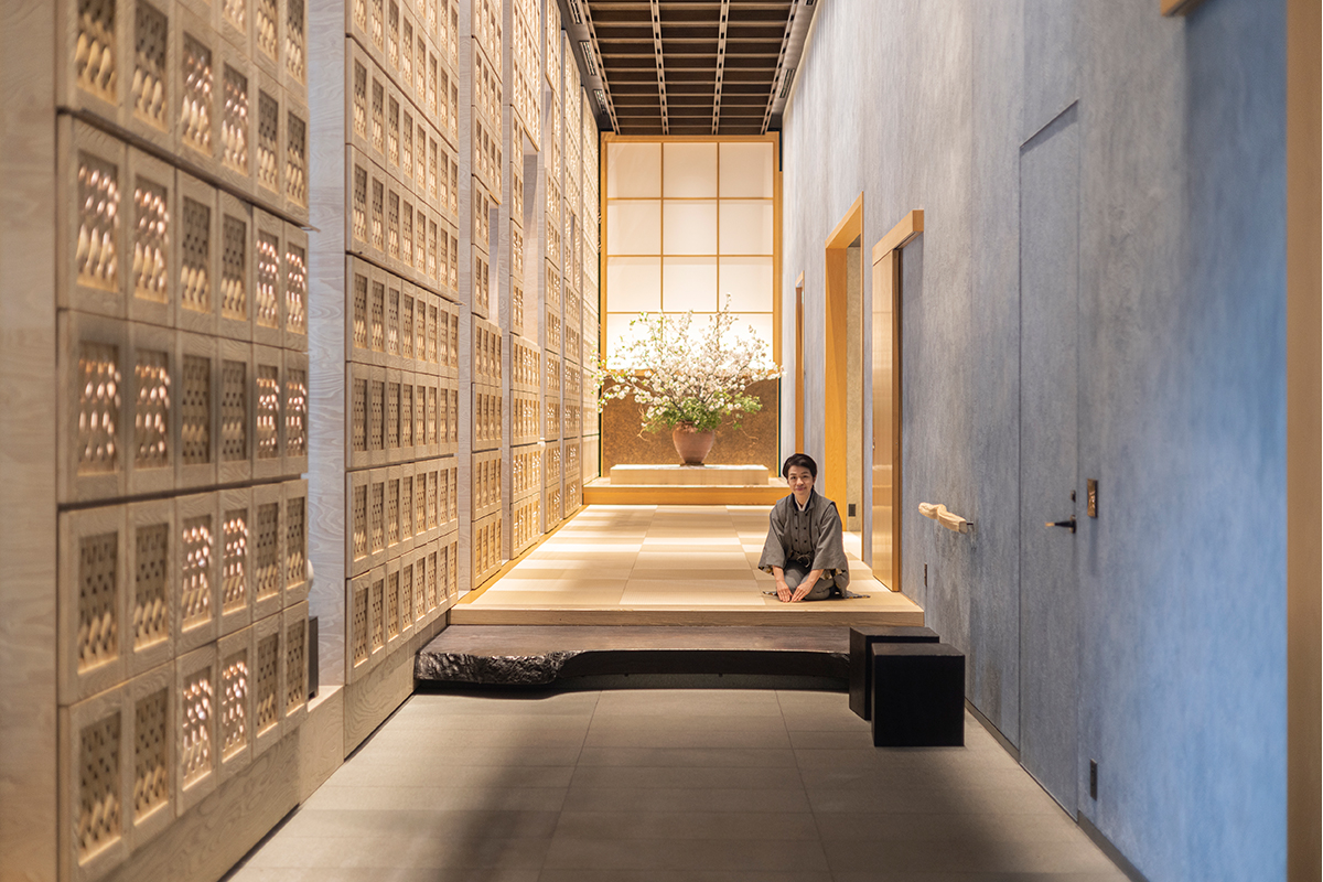 東京の中心にあるとは思えない、落ち着いた佇まいの「塔の日本旅館」。扉が開くと、玄関に漂う「山田松香木店」による「星のや東京」オリジナルの香りに包まれ、非日常へ誘われる。畳敷きの館内に漂う自然なイグサの香りにも心安らぐ。