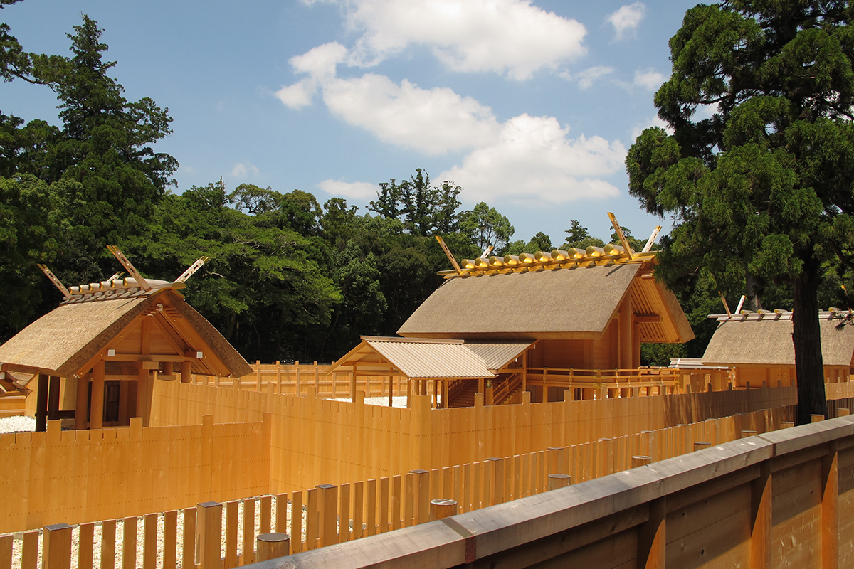 古来の建築様式「神明造」にのっとり素木の檜でつくられる伊勢神宮の社殿。20年に一度の式年遷宮で社殿が建て替えられる。