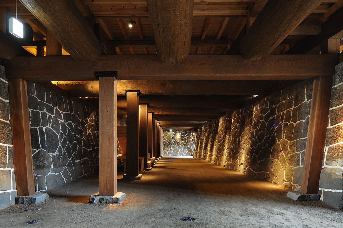 復元工事の際に、本丸御殿で九州のアカマツを梁に使用。写真は本丸御殿の地階にある闇(くらが)り通路で、梁を間近で見られる。