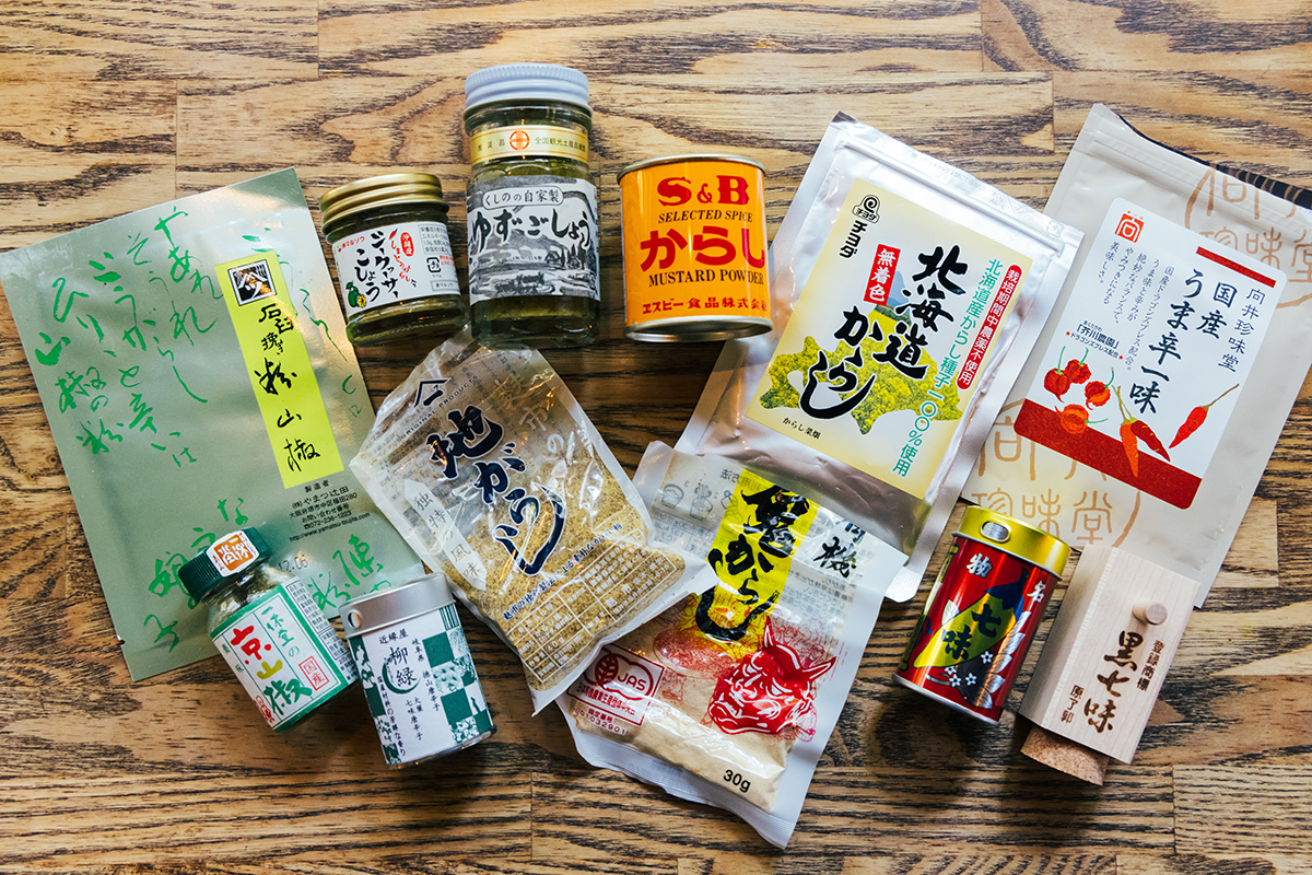 日本料理で出番の多いからしは、産地が異なるものを数種類常備。山椒、七味唐辛子、柚子胡椒なども料理に合わせ使い分けている
