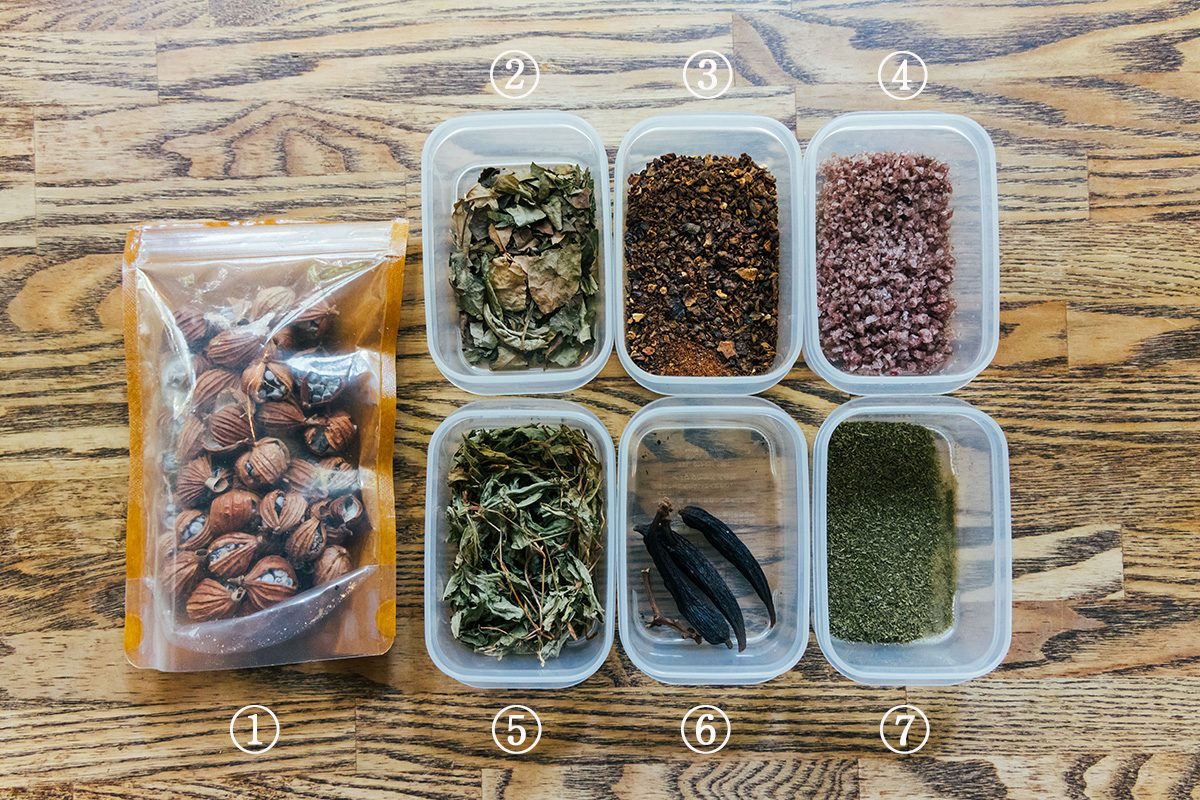 日本各地に自生する植物からなる〈スパイスを探す〉シリーズ。①月桃の実 ②オオバクロモジ ③ハマナスの実 ④ガマズミの実(佐渡塩と) ⑤ヤナギタデ ⑥ツチアケビの実 ⑦スジアオノリ。インドのスパイスにはないやさしい香りをつけることができる