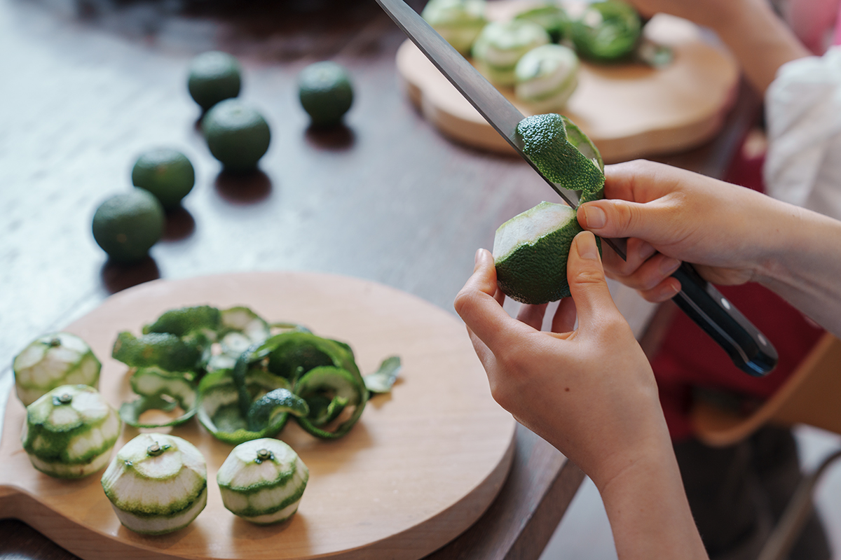 ①青柚子は洗って水気を取り、皮をむいて千切りにする。苦みが強い白いワタが多く残らないよう、薄めにむくのがコツ。残った実は果汁を搾り、同量の醤油と合わせてポン酢にするといい。