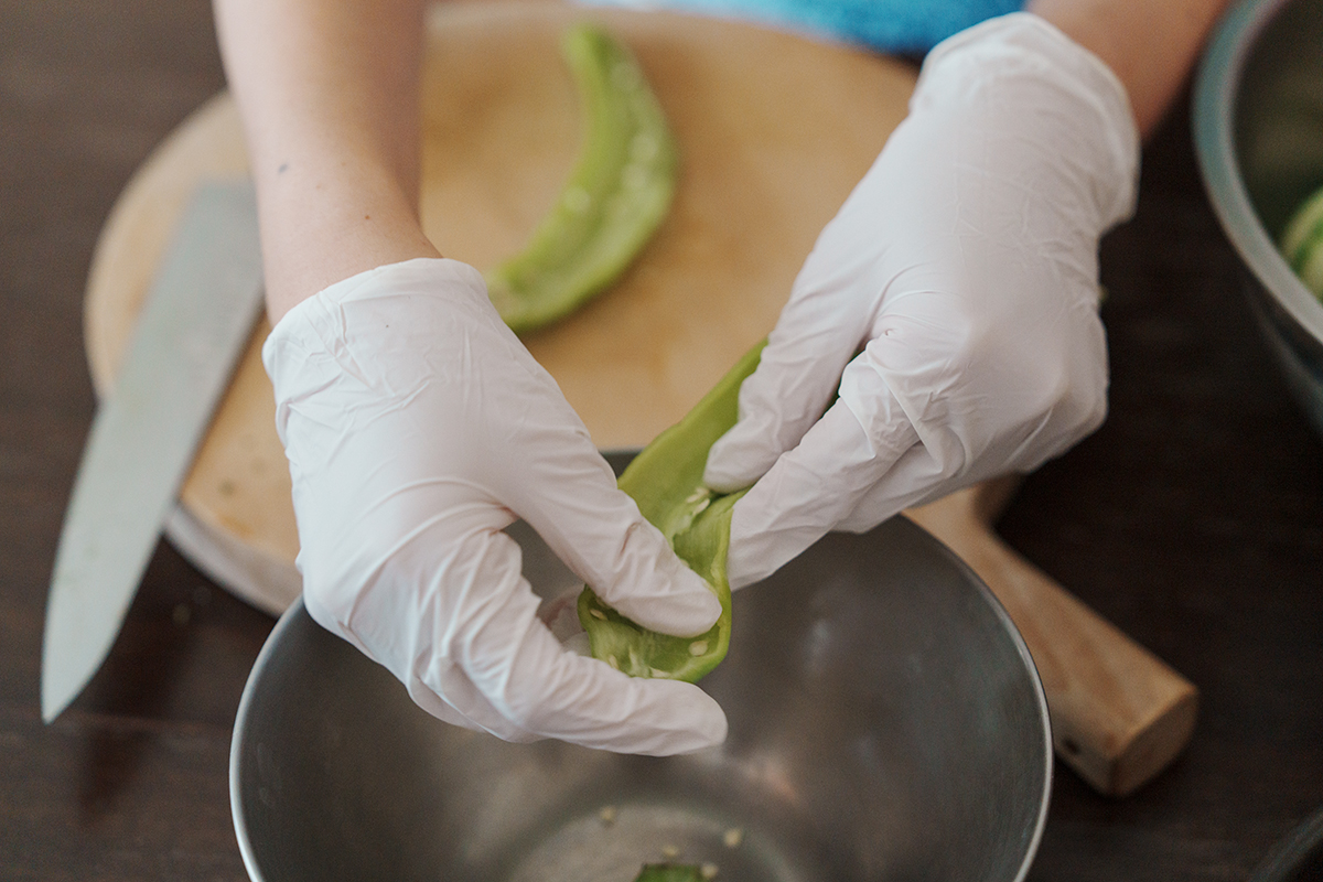②青唐辛子は2、3種類使用。一般的な青唐辛子とジャンボサイズの「福耳」に、辛みのない万願寺唐辛子を加えてもいい。ヘタと種を除いて千切りに。刺激が強いのでビニール手袋は必須。
