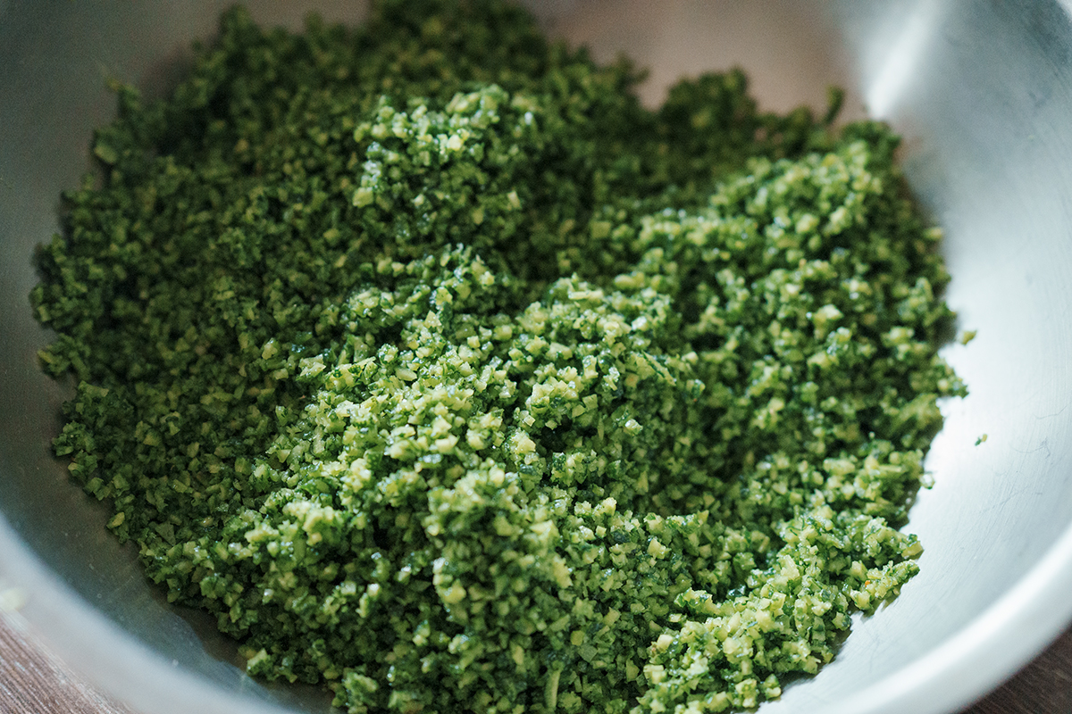 ④細かく刻まれた柚子と唐辛子をよくすり合わせる。ここでは素材同士を混ぜ合わせ、馴染ませるのが目的。1年分たっぷりと仕込み、すぐに使わない分は小分けにして冷凍保存を。