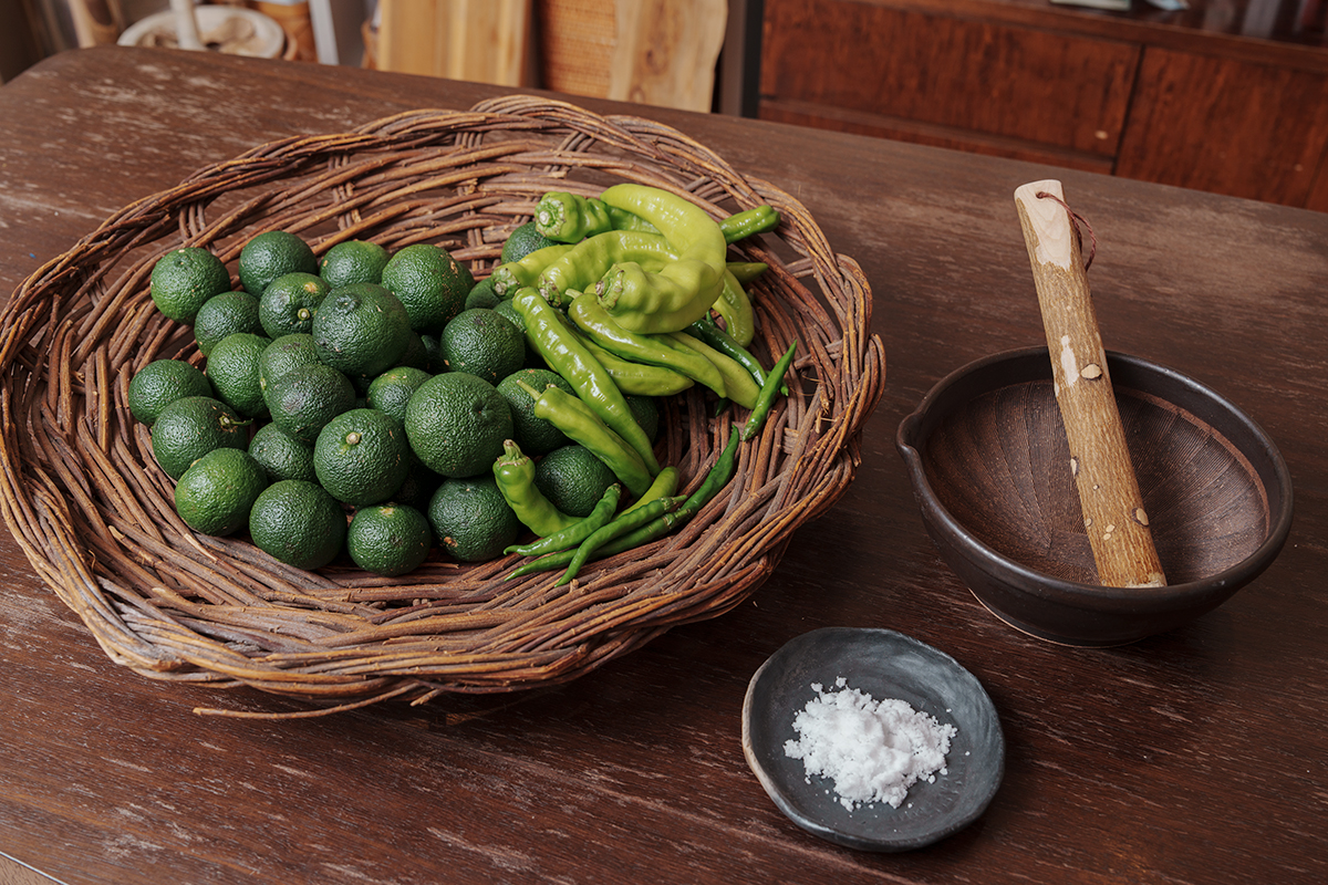 九州の家庭でごく一般的に使われてきた柚子胡椒。柚子皮、唐辛子、塩を合わせたもので、いまや海外でも知られる。未熟の青柚子+青唐辛子でつくる青柚子胡椒、完熟の黄柚子+赤唐辛子でつくる赤柚子胡椒があり、前者はフレッシュな香りとピリッと刺激的な辛みを、後者はまろやかな旨みと辛みを楽しめる。寺本さんの柚子胡椒は、粒をしっかり残しているのが特徴。噛んだときに立ち上る柚子の香りと食感がよく、このままご飯のお供になる。