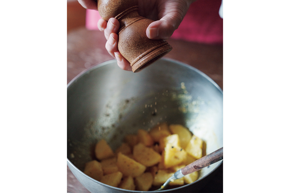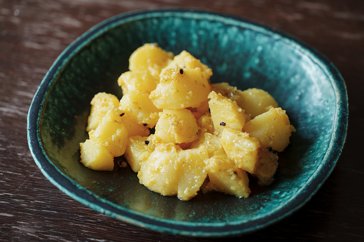 インドやネパールで漬け物を指すアチャール。フェネグリークを油でテンパリングし、メープルシロップのような香りを立たせるのがポイント。ほくほくのジャガイモ、挽きたての山椒がよく合う。
