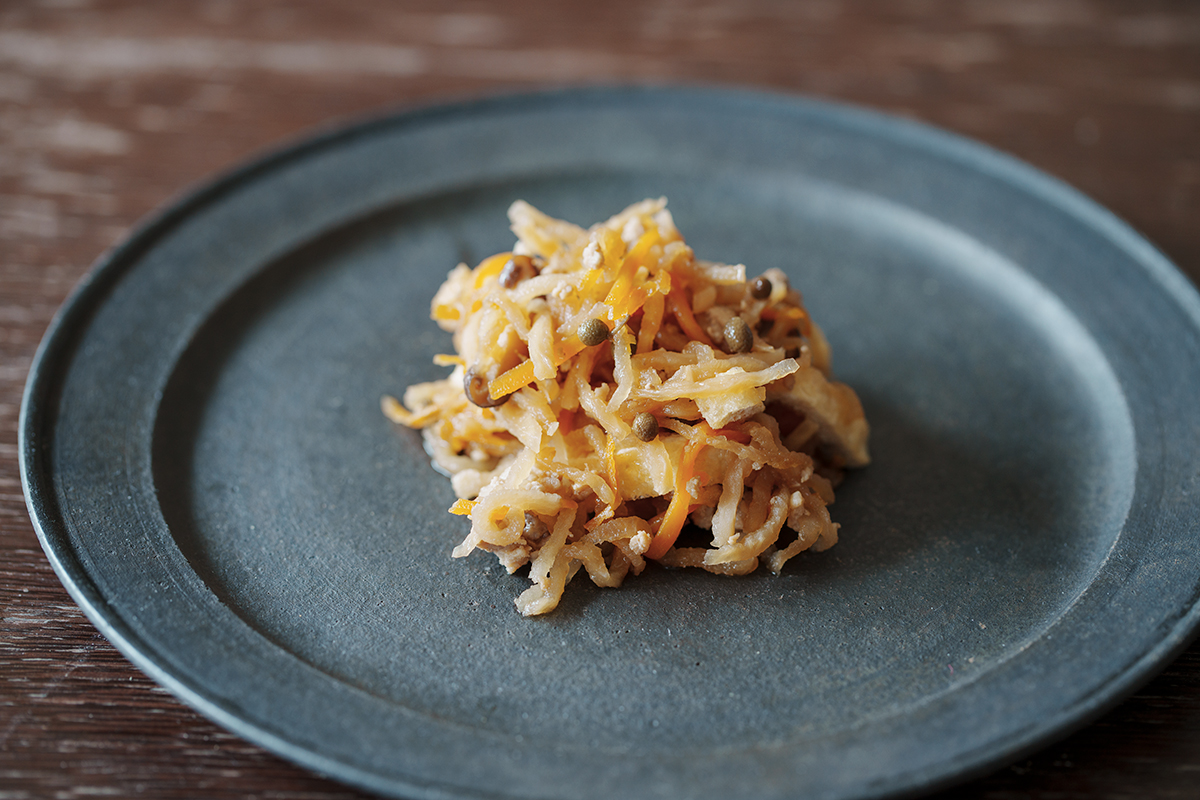 寺本さんの常備菜。切り干し大根に豚肉、油揚げが加わり、食べ応えのある一品。実山椒を加えて煮ることで、味わいが一気に引き締まる。ご飯のおかずにも、酒のあてにも。