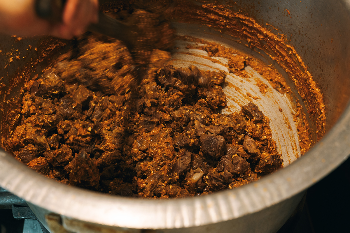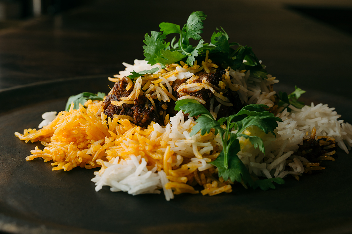 マトンはゆでるのではなくコンフィ(油煮)にし、バスマティライスは高い塩分濃度の湯で高温短時間、下ゆでする。米はパスタと違って必要以上の水を吸わないので、塩辛くなり過ぎることもない。グレービー(ビリヤニのベースとなる濃いソース)を煮詰める際は油を加え、鍋の側面が熱されることで濃縮された部分は、丁寧にゴムベラで落とし込む。フライドオニオンは低温で時間をかけ、チョコレートのような焙煎香が出るまで揚げる。一つひとつの工程がすべて出来上がりの味につながっている。