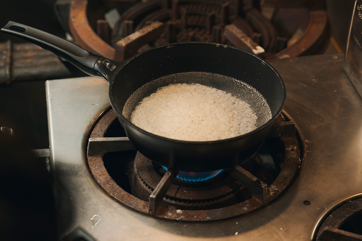 ④鍋で塩を入れた水を沸騰させ、浸水させたバスマティライスを水を切り投入。鍋の底につかないように全体を混ぜ、中火で5分ゆでる。
