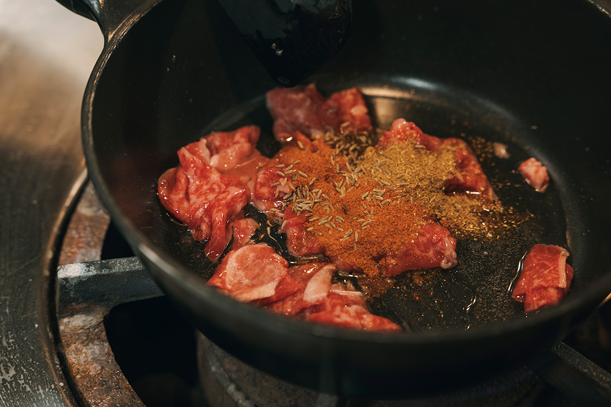 ①フライパンに米油、牛肉、【スパイス】を入れ、中火にかけて牛肉の色が変わるまで炒める。