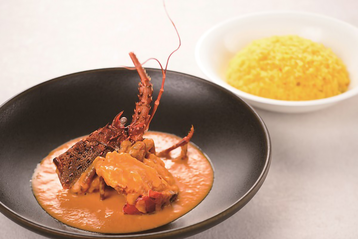バターで丹念に炒めた香味野菜や果物を加えたルーは、マイルドな欧風スタイル。味のベースとなるブイヨンにもこだわり、風味豊かなカレーに仕上げた。さらに伊勢海老の旨みを凝縮したソースを加え、より濃厚に。伊勢海老、サフランとともにフレンチならではの技を感じられる贅沢なひと皿だ。小誌ECサイトではクリームスープとのセット商品を販売中。