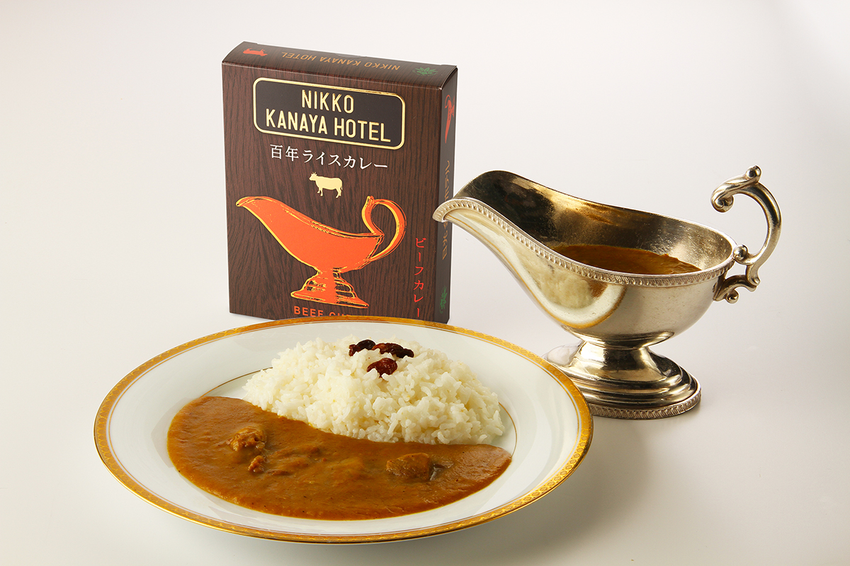 「百年ライスカレー」も往時を伝える料理。大正期のレシピを元に、2003年当時の総料理長・中西健一氏が試行錯誤を重ねて復刻再現。ホテルの定番料理に。レトルトも、ホテル流にカレーソースと具材のビーフは別パックに。甘みの後にスパイシーな辛さがわき上がる独特の味わいだ。