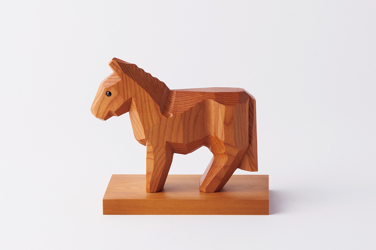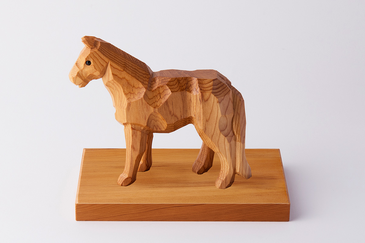 馬がもつしなやかで力強い筋肉を、銘木・イチイの美しい木目を生かして造形。細く長い脚は、繊細なタッチで彫りが施されている。