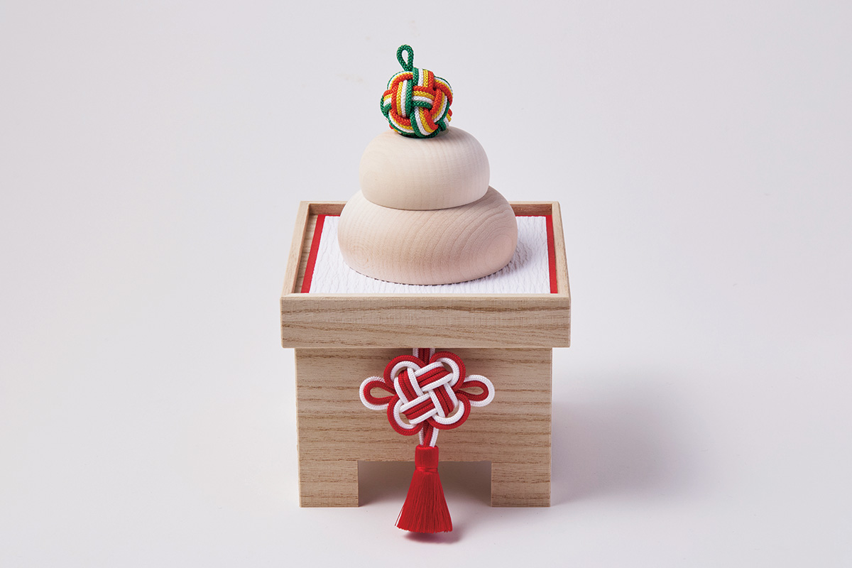 桐の三宝に、木製の鏡餅・組ひもの橙・飾りひもを詰めた末長く使える年神さまの依り代。入れ子にでき、収納場所にも困らない。