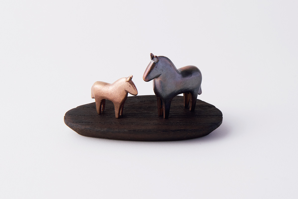 馬が駆ける姿を躍動的に表現。平面・立体のいずれも、実際の馬の毛色に倣った5色を展開。小さな干支飾りとしても活躍する。