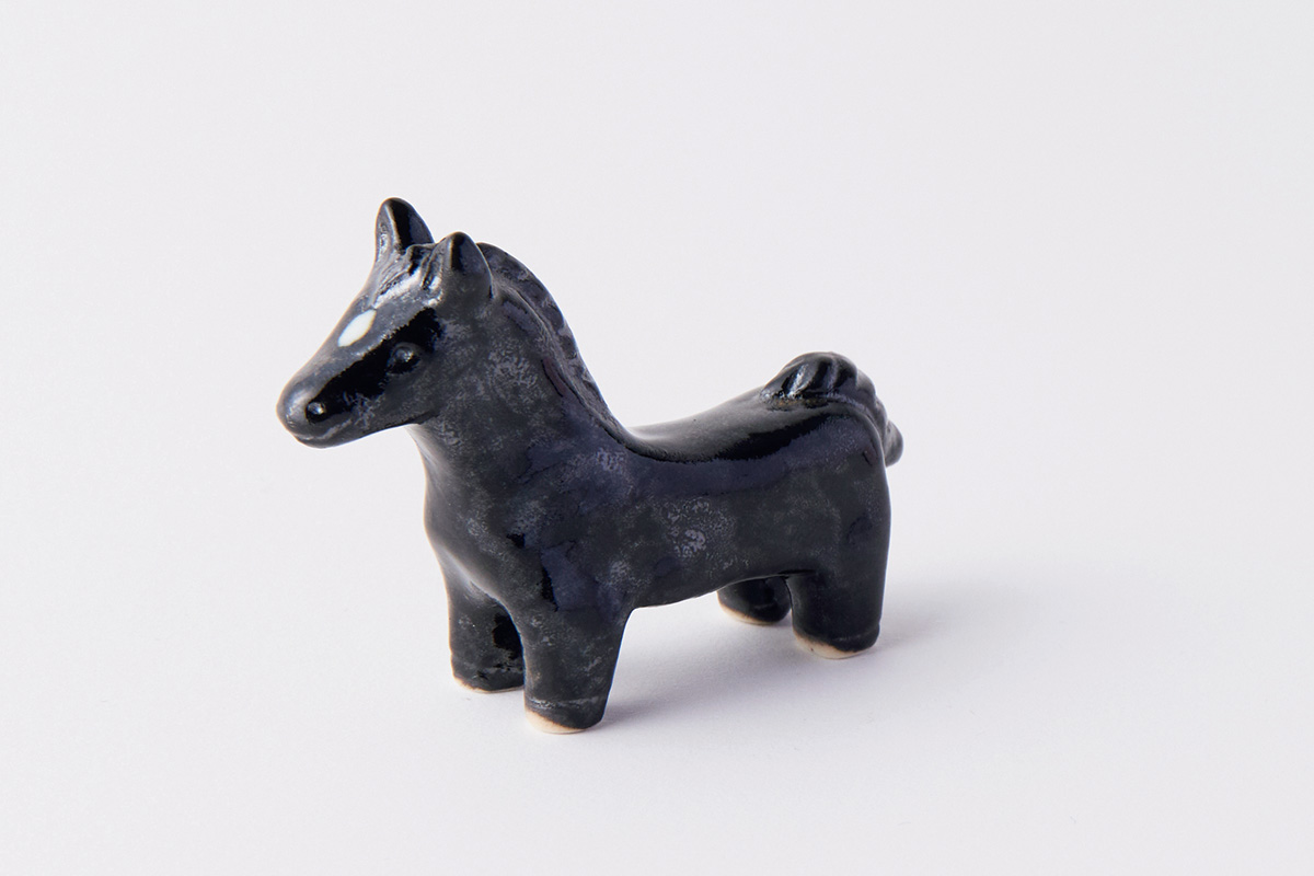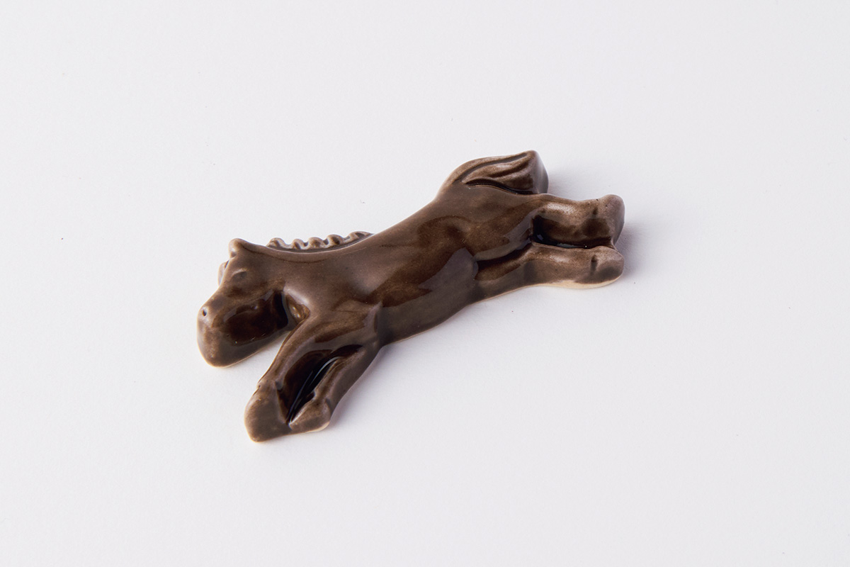 箸置きとしての実用性を追求し、脚は短くデフォルメしつつも馬らしさを表現。額に走る流星模様の細やかな表現にも注目したい。