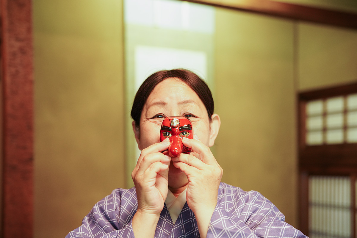 ゲームに負けたら、楽しく罰杯を受けよう。酒を飲み干す際は、お面を被ったようにべく杯を持つのがポイント。大ぶりな天狗の杯は、写真映えも抜群だ