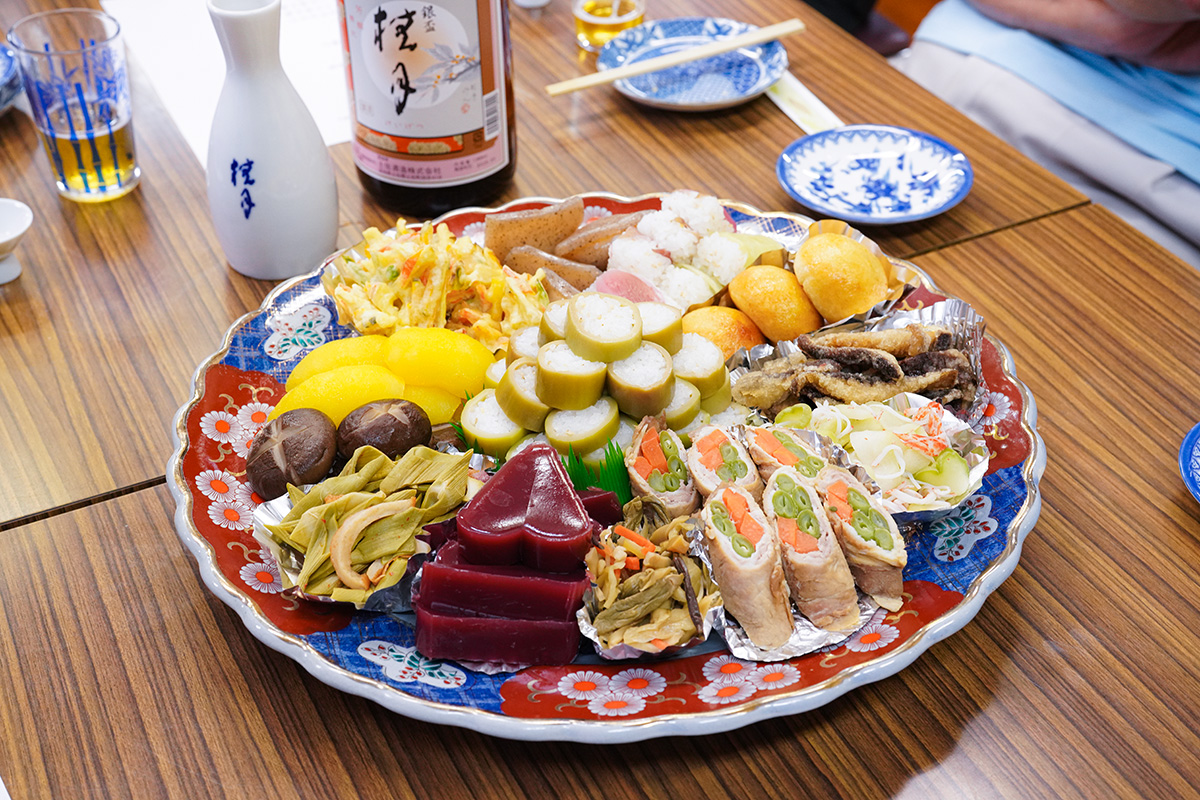 冠婚葬祭をはじめ、祝い事や節句の際に催される“おきゃく”の付き物といえば、皿鉢料理。大皿を用いて、刺身や鮨、煮物、和え物、そして甘味や果物などが賑やかに盛り込まれた料理の総称だ。下ごしらえこそ手間と時間を要するが、事前にすべてを用意してからゲストを迎えることができるので、給仕に追われる人も出ず最初から宴の一員に。あとは、各自が好きなものを好きなだけ。現代でいうビュッフェスタイルのような、とても合理的でみんなに優しいシステムなのだ。