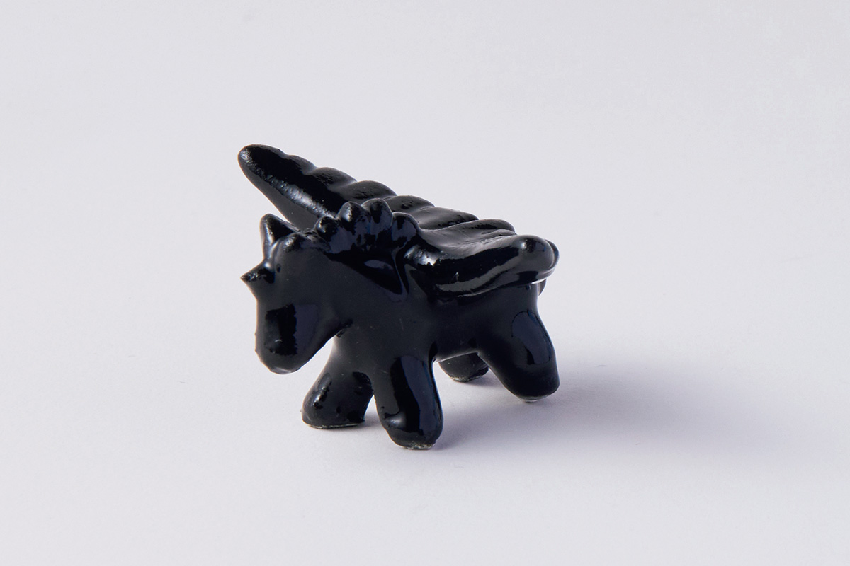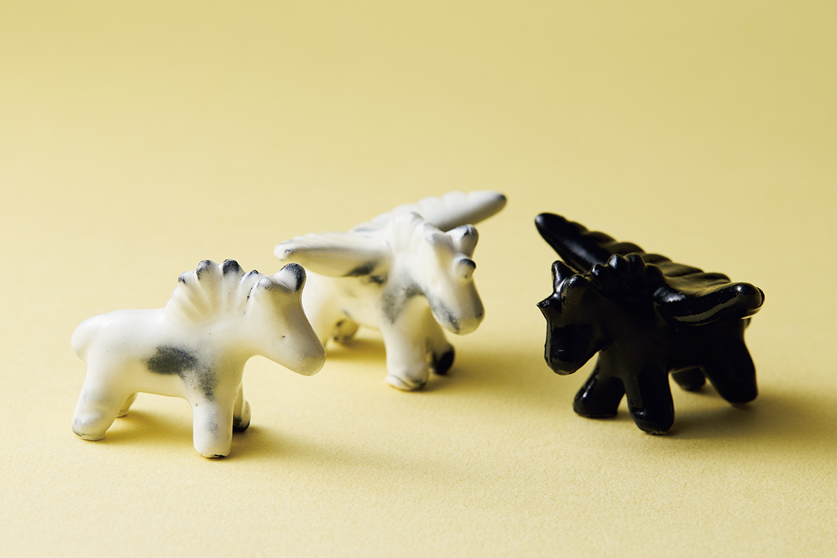 ピジョンカップなどのうつわと同じ土、同じ製法でひとつずつ手づくりするフェーブ。化粧土も柄杓で一点ずつ丁寧にかけていく。翼をもつユニコーンの姿や表情がどれも違っていとおしい