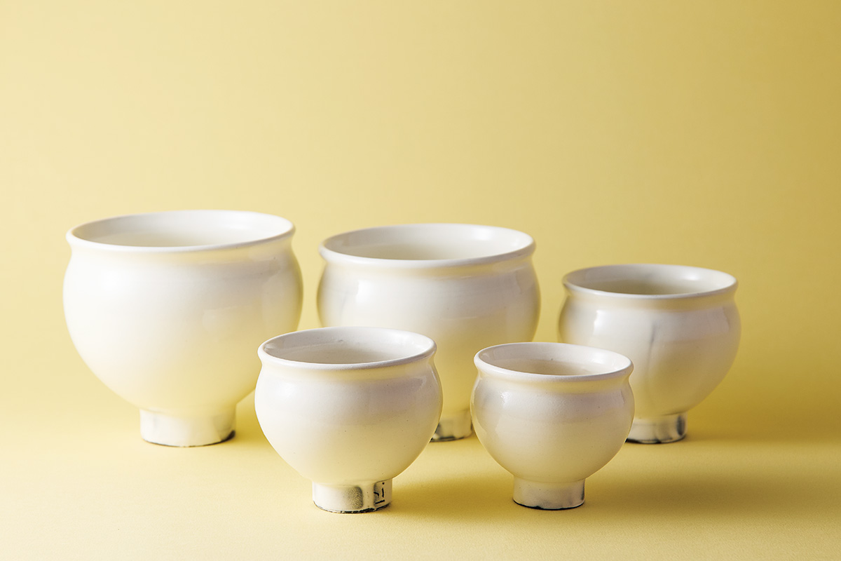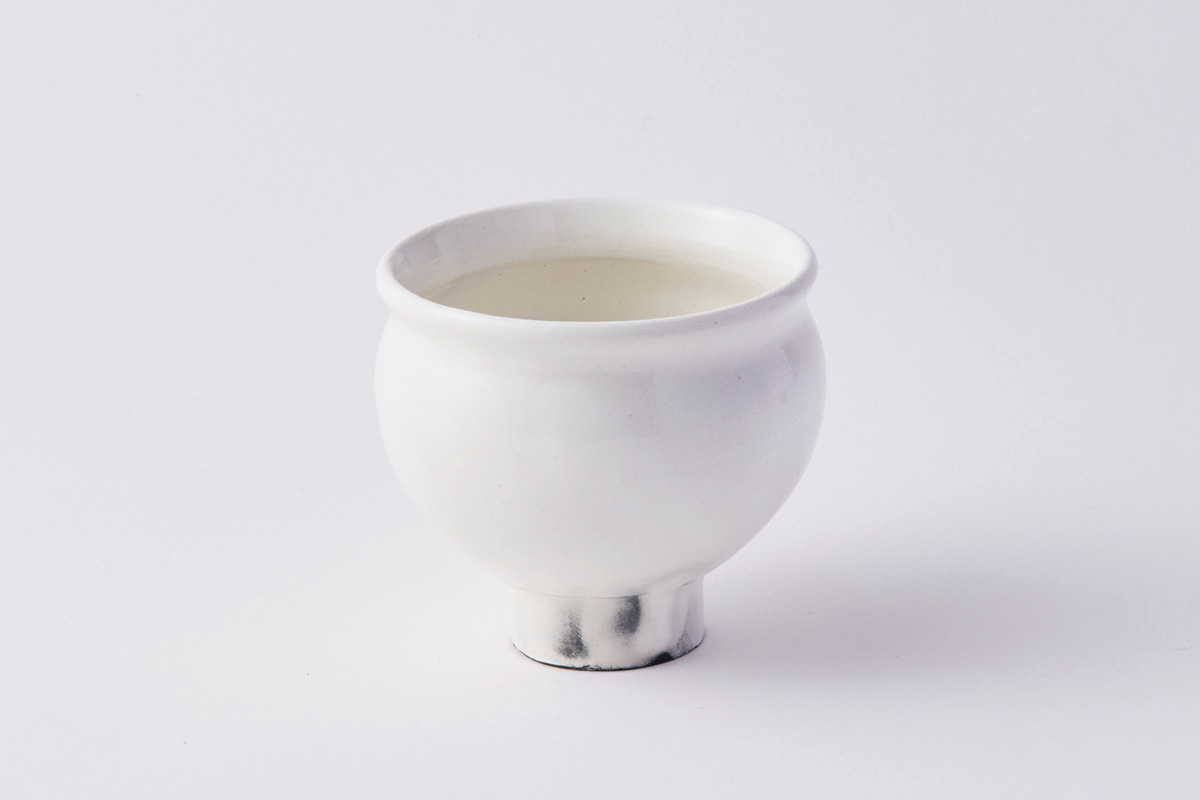 やや外側に反った繊細な口縁は中国の天目茶碗を、ボディのカーブは朝鮮半島の高麗青磁を参考にしたという。歳月を重ねる中でそのフォルムは少しずつ変化し、より高台がすぼまったスタイルになった
