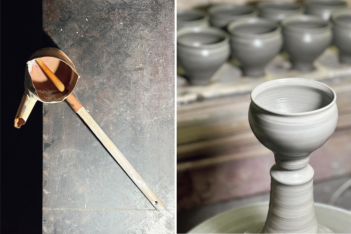一点ずつろくろを挽いて成形し、化粧土は柄杓で流しかけるため、完成したピジョンカップはどれも微妙に表情が異なる。揺らぎがあったりゆがんだりすることで、工業製品をつくっているつもりでも手仕事の温もりが宿ると鈴木さん。