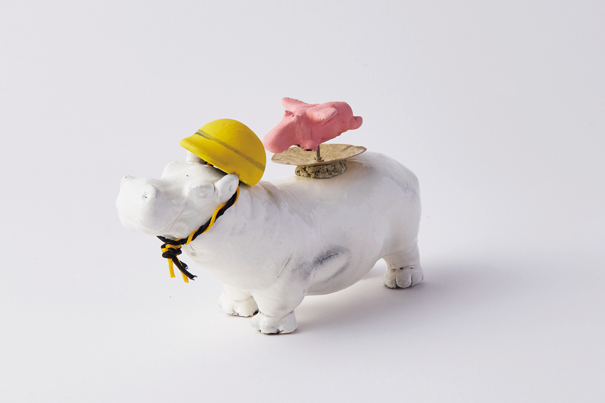 カバ好きが高じた遊び心たっぷりの燭台。工事現場をイメージし、ヘルメットは、ひもも手撚り。針どめにはピンクの羽付きのカバが。