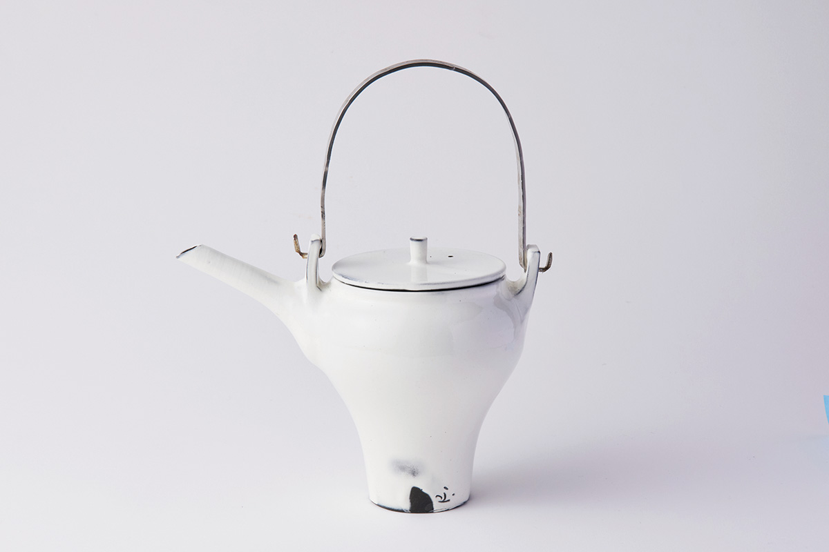 ブリキのジョウロを思わせるフォルムが印象的なティーポット。ステンレスをたたいて自作するという持ち手がさらに味わい深い。