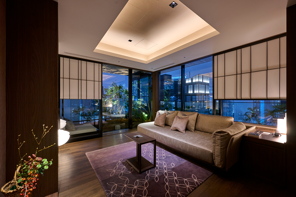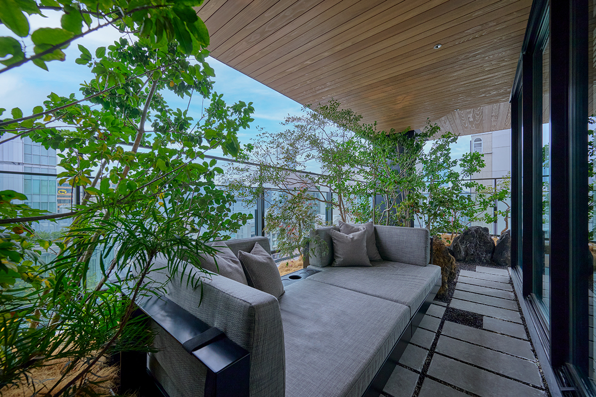 客室での贅沢は温泉だけにとどまらない。高層階でありながら銀座を体感できるようにと、各部屋のテラスには植栽が楽しめる“庭”が設けられ、そこで過ごすことができる。「東京では各部屋に花木の名をつけており、庭に植栽された木々の中に、部屋名となった木が植えられています」と関係者の言葉。そんな粋な計らいに、銀座の柳の木のように育ってほしい思いがする。