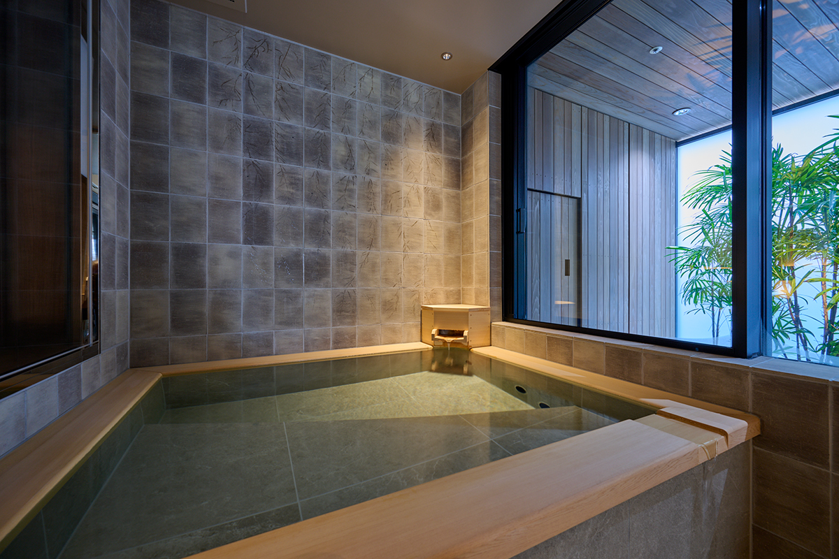 さらに、「ふふ 東京 銀座」では、すべての客室で天然温泉が楽しめるのだ。宿で“優しく包み込む 熱海の温泉”と表現しているように、この温泉は「ふふ」の原点でもある熱海から毎日運んでいる。つまり、世界の一流ブランドが軒を連ねる銀座中央通りの天空で、ゆったりと客室内の温泉に浸かり、癒される滞在がかなうということだ。
