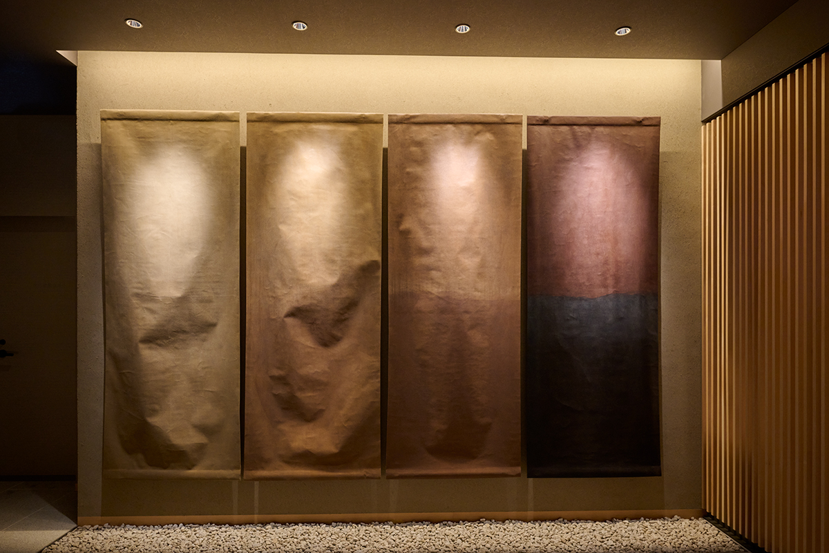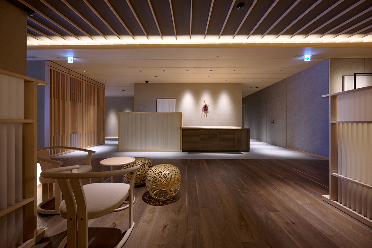 はやる気持ちを落ち着けて早々に向かった「ふふ 東京 銀座」。到着時、ひそやかなエントランスドアをくぐり、建物内に一歩入って周囲を観察すれば、その土地の歴史や伝統に敬意を払う「ふふ」らしい空間が。江戸から東京へ、そして未来へとつなぐ伝統をアートワークに昇華させた「竹垣」や「瓦土塀」が静かに出迎える。ここで心を整え、いざ「ふふ」の新たなる世界へと、エレベーターで上階ロビーへ。