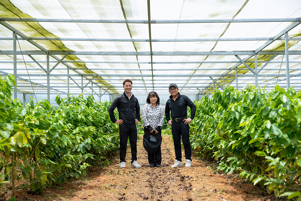 現在は、初代の砂川俊夫さんが運営していたコーヒー農園から新たに場所を移し、2代目の省吾さん、3代目の嘉勝さんが、広さ約2800㎡の「石垣島珈琲農園」で初収穫に向けて準備中だ。島で農業を営む上で台風は強敵だが、過去の被害経験を生かして強靭な鉄骨ハウスを建設。10tダンプ60回分の土を運び、コーヒー栽培に適した弱酸性土壌をつくり上げた。