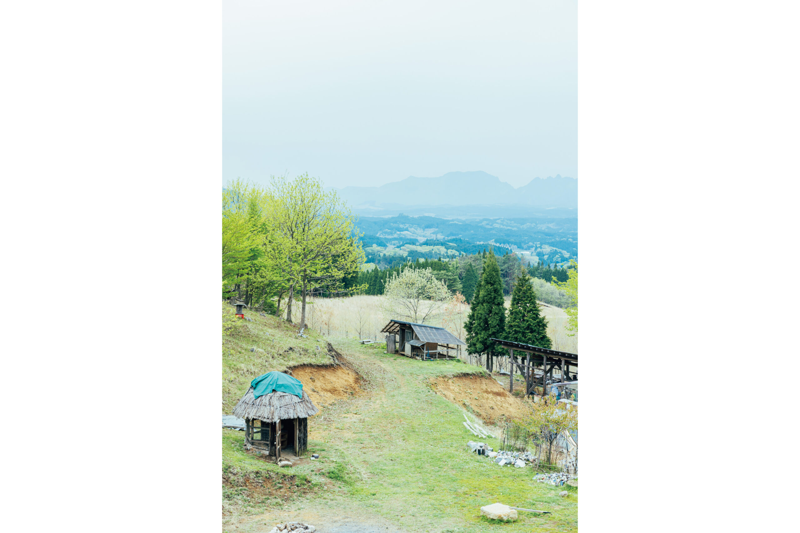 「広々として、空気が気持ちのいい場所でゼロからはじめたかった」と、高千穂の丘陵地に生活と創作の場をこしらえた。谷の向こうに阿蘇の山々が見える