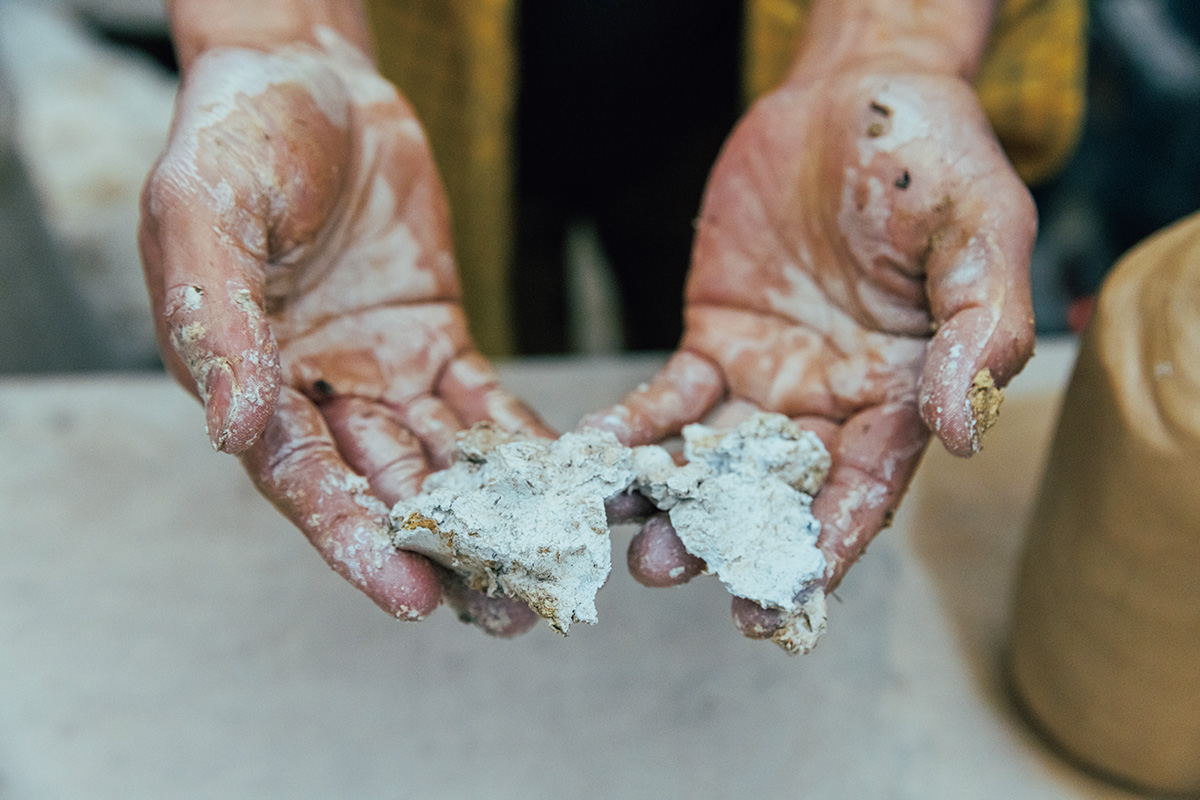 一般的な陶器の土は、風化した岩石が何万年もかけて沼や湖などに堆積し、干上がってできる水肥粘土。しかし、高千穂の黒原土は造山運動の中で圧縮作用を受けた岩石が粘土になったようなもの。フレッシュで、粒子が揃っていない分暴れる土だが、思った通りにならないところがいいという。