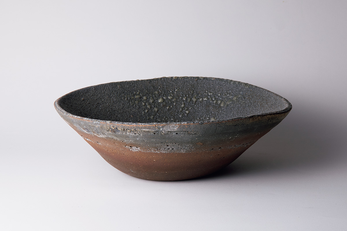 高千穂の黒原土を用いた鉢。暴れる土ゆえにろくろで成形する時点でもかたちが決まりにくく、焼成後の表情も想像以上のものになる。