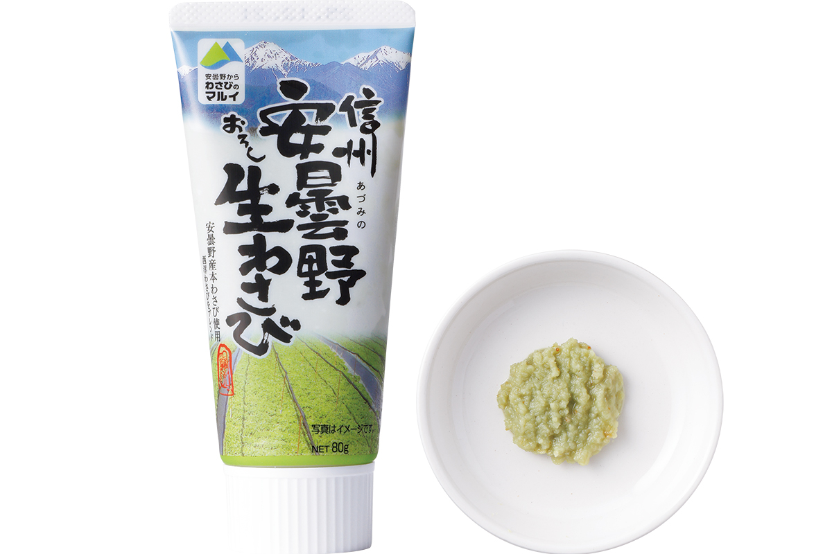 アルプスの雪解け水が流れ込む畑で育ったわさびをすりおろし、本わさびの風味や食感、清涼感のある辛みを味わえる贅沢な品。「手軽に使えながら、わさびの風味をしっかり感じられます」。大量生産でつくられるチューブ入りとは別もの。刺身、肉料理、茶漬けなどに。