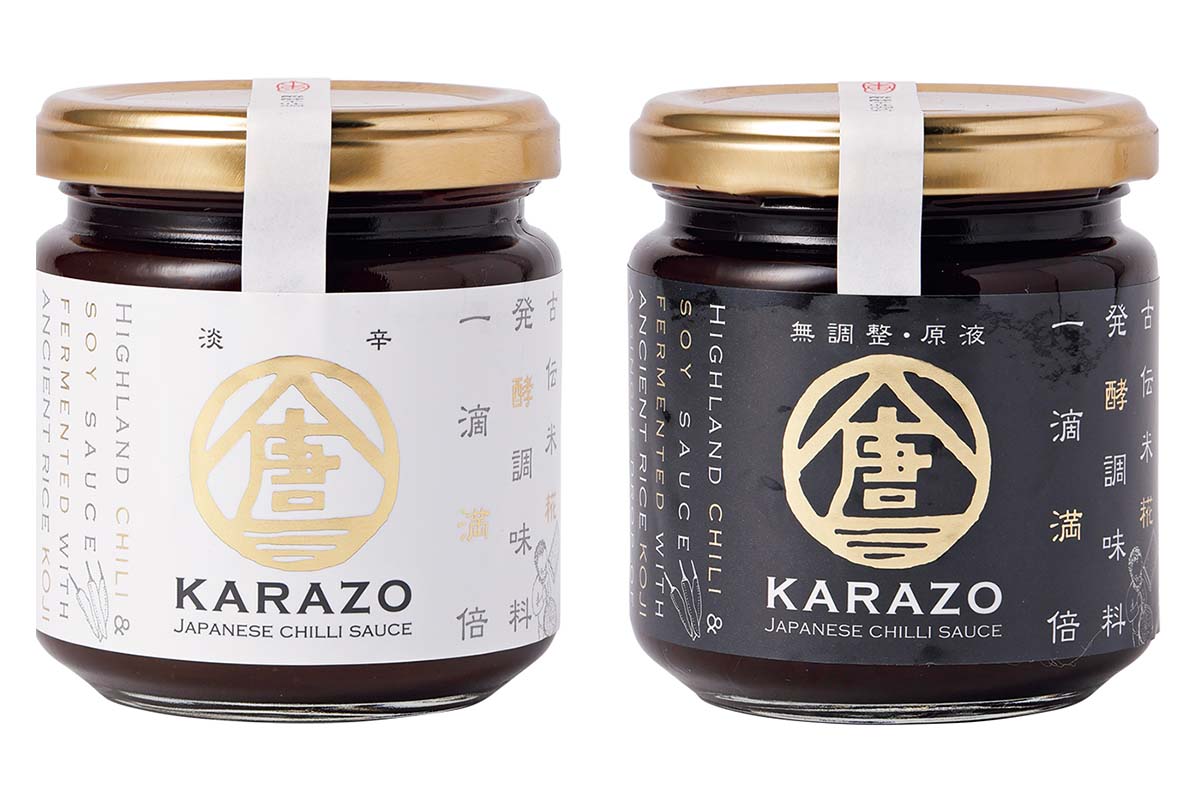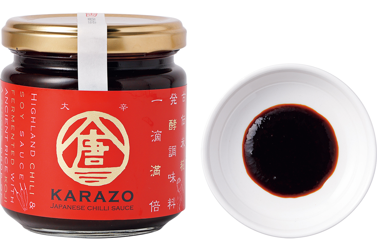 「天空の唐辛子」に、地元米の米糀、こうのとり大豆の醤油を使い3年以上の発酵・熟成。「大辛口をアジア系の料理をつくるときに、愛用しています」。「大辛口」のベースになる「無調整原液」、兵庫県産柿酢と梅を加えた「淡辛」もある。