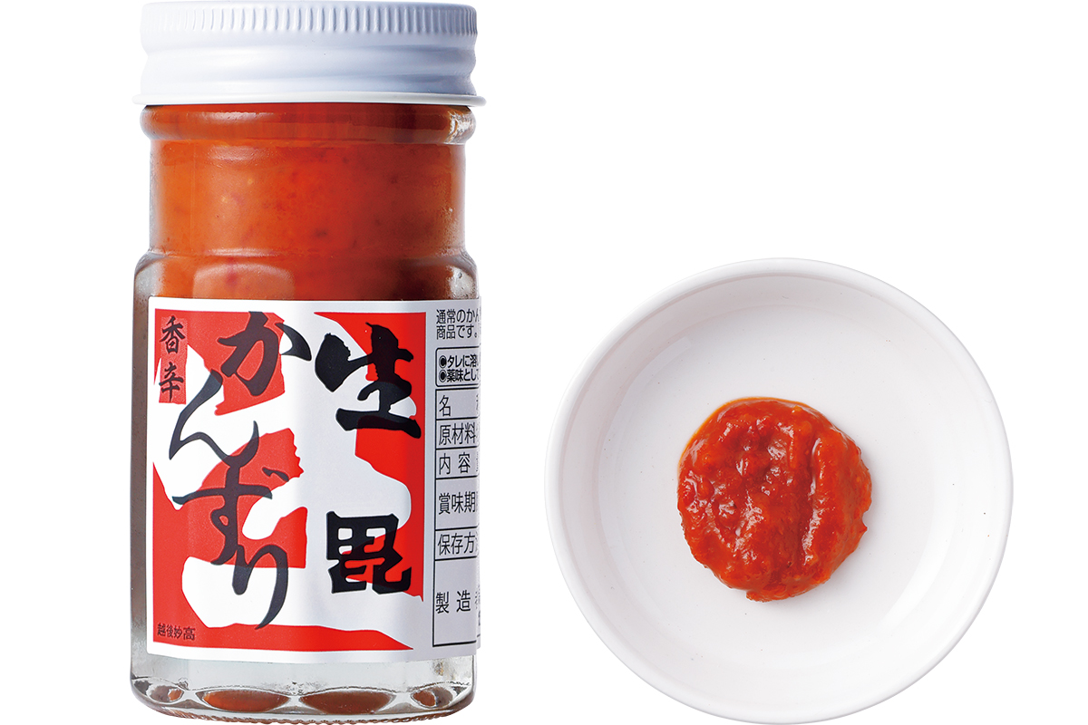 唐辛子と糀、柚子、食塩でつくられる「かんずり」。こちらは加熱処理(発酵止め)をしていないため柔らかく使いやすい。風味と柚子の香りがより豊か。「照り焼きのレシピに少し加えるとアクセントに。練りゴマと混ぜてソースにするのもいい」