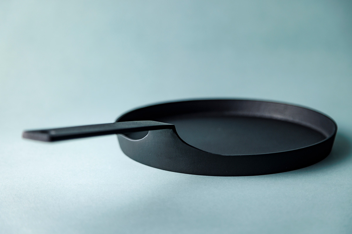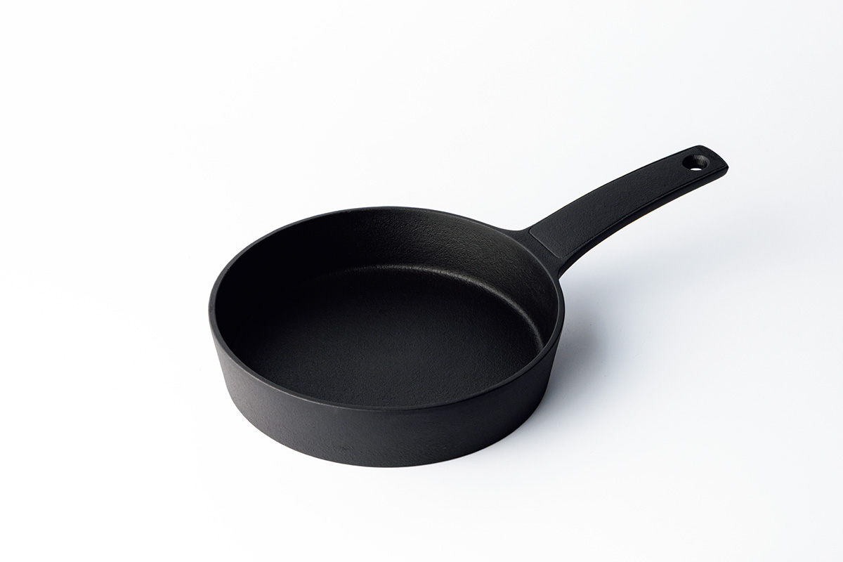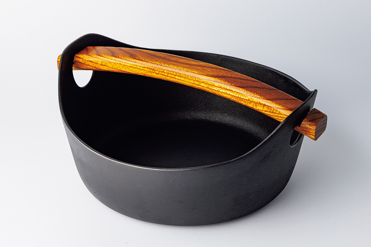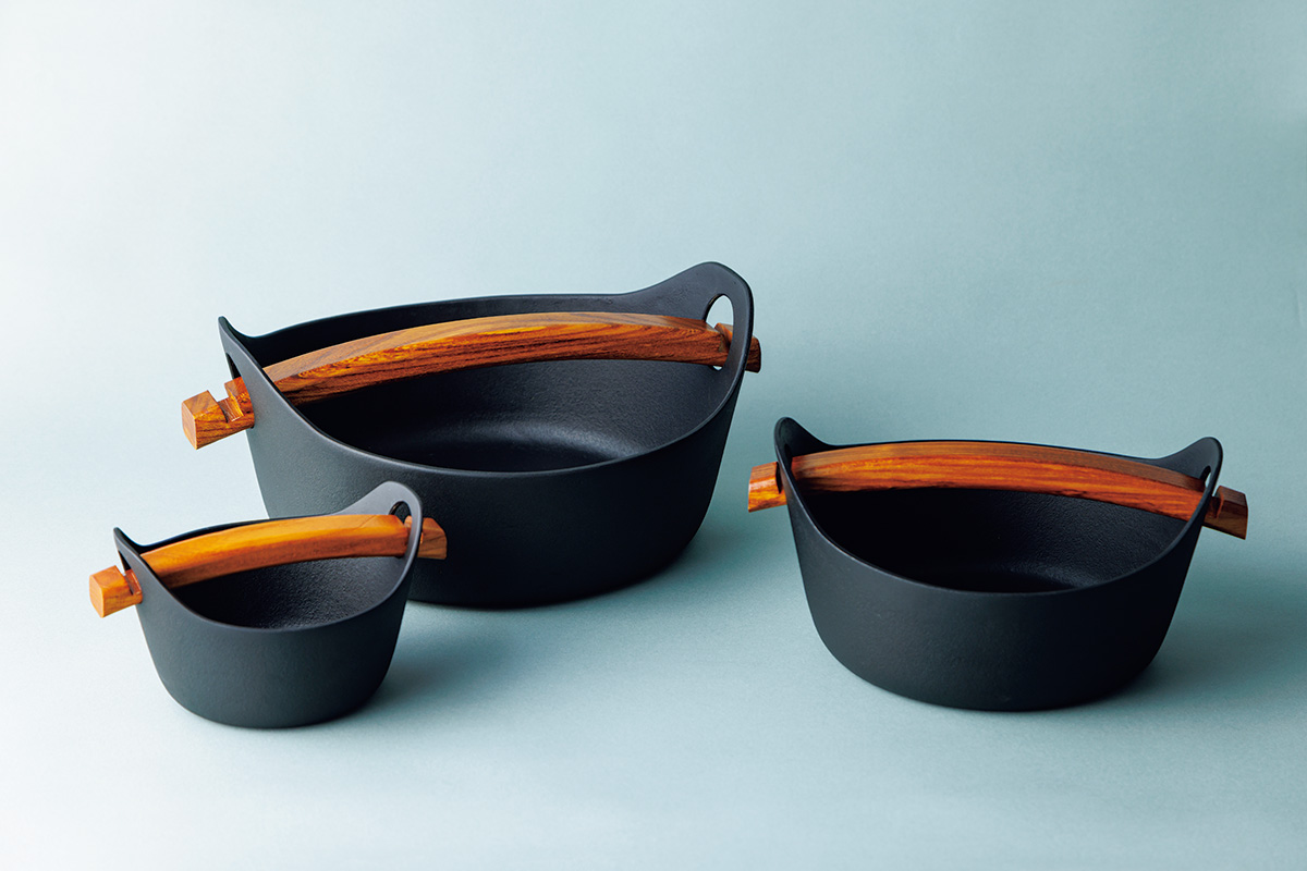 無駄を省いたシンプルな鍋は、木製の持ち手がアクセント。黒と茶のコントラストがモダンな印象だ。熱伝導率が高く保温性にも優れているため、煮込み料理に最適。ステーキや野菜ソテーもジューシーに仕上がる。持ち手をスッと外せばうつわとしても機能。調理後、そのままテーブルに置いても絵になる。同時期に誕生したワンハンドパンやシャロウパンは、縁の高さや持ち手の長さが絶妙で、細部までこだわり抜いている。