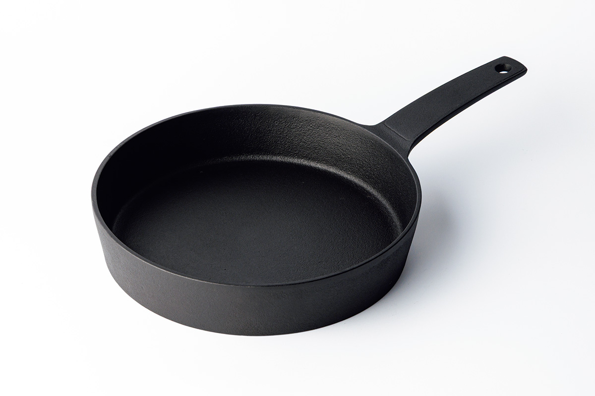 多岐にわたる調理が可能なワンハンドパン。シャープな印象のシャロウパンは、鉄の鋳肌の特徴を生かした温もりのある風合い
