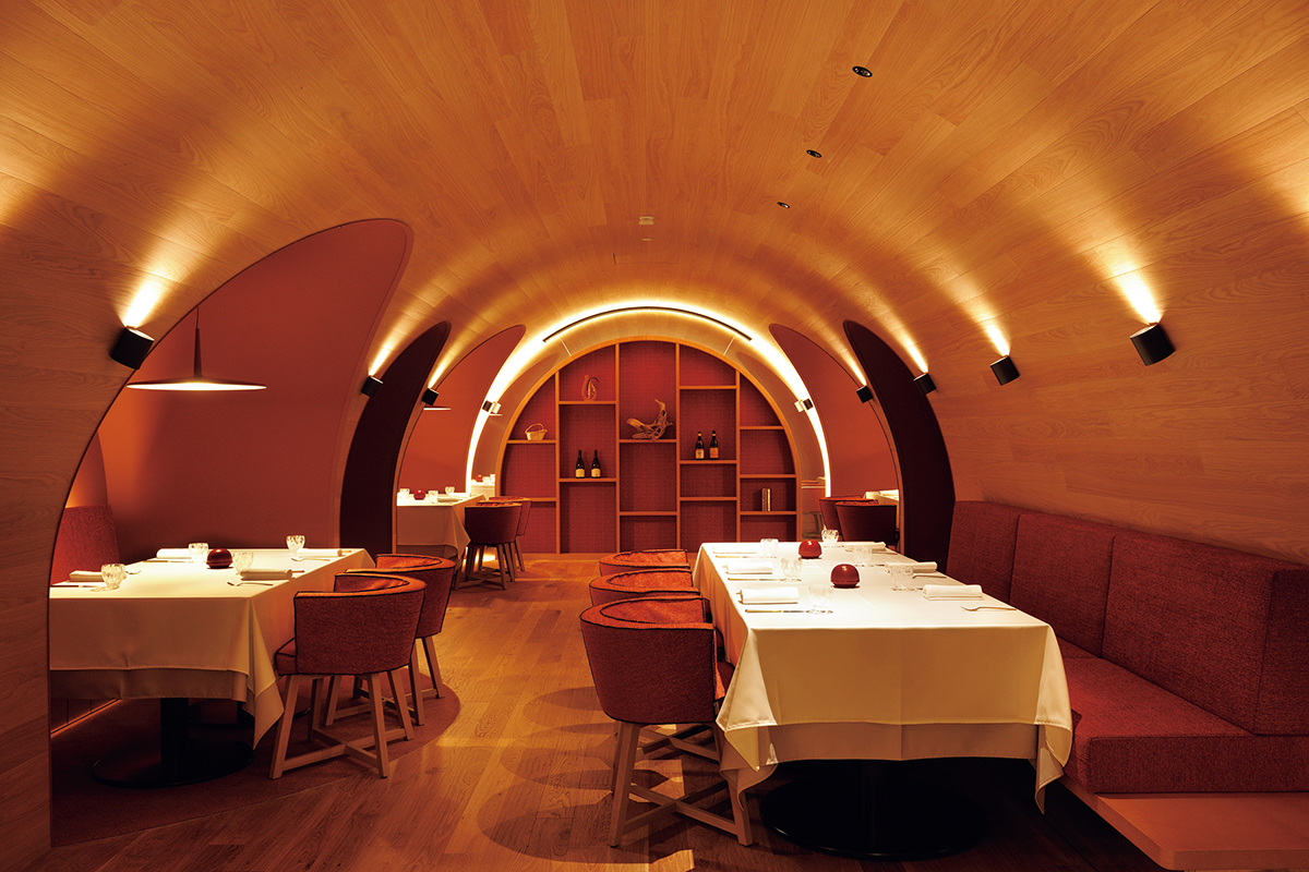 季節によって変化する全9品のディナーコースの6品に唐戸市場から仕入れたフグを使用。身はもちろん、骨、皮まで余すところなく使い、調理法によって変化する食感や旨みを存分に味わい尽くすことができる。フグ皮の煮凝りを温かいフグ出汁と一緒に口に含むことで旨みが幾重にも広がるスープメニュー、柑橘の泡の酸味とフグの旨みが混然一体となるカルパッチョなど、驚きに満ちた味覚と出合わせてくれる。