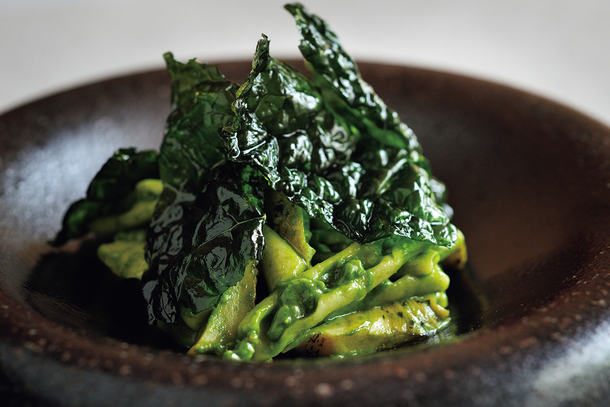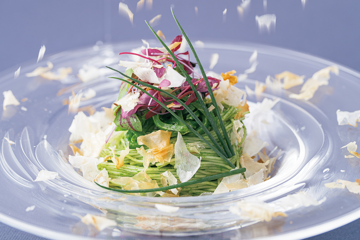食感が楽しいフグの皮と、爽やかな香りの福ねぎのピューレをからめた冷製パスタ。仕上げには直前に火を入れてパリッとさせたフグ節を散らし、香ばしい香りと旨みをプラス(3月18日以降は春メニューに変更)
