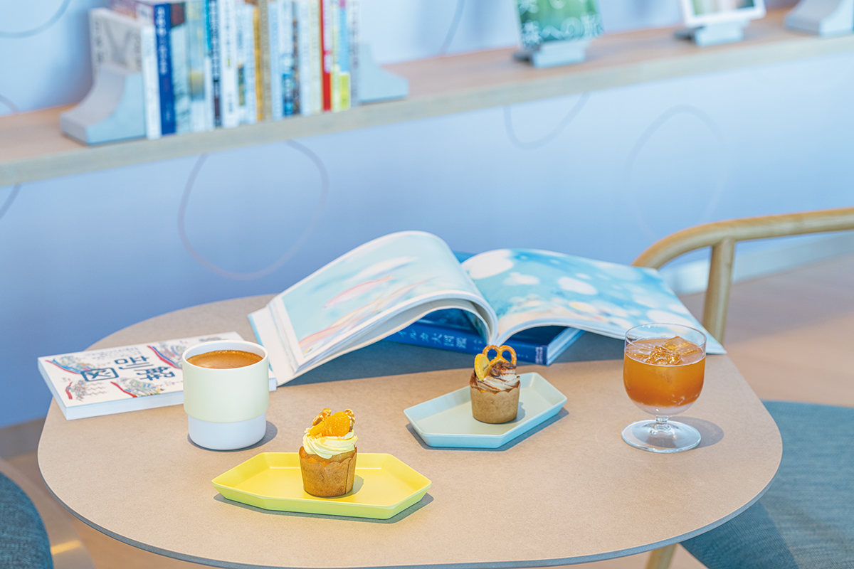 海、船、山口にまつわる約500冊の本が並ぶ「Books&Cafe」。カップケーキなどのスイーツ、甘酒入りモクテル、コーヒーが楽しめる。夜は酒も提供されるラウンジに。