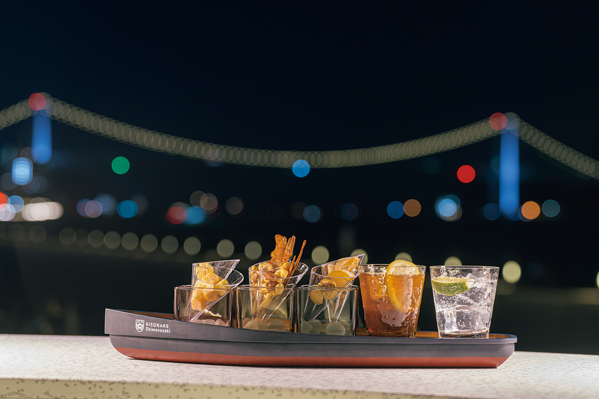 カフェや屋外のテラス席で夜景を眺めながら寛ぎの時間を。地元産クラフトコーラ、ジントニック、おつまみがのった海峡ナイトラウンジセットはコンテナ船をイメージ。