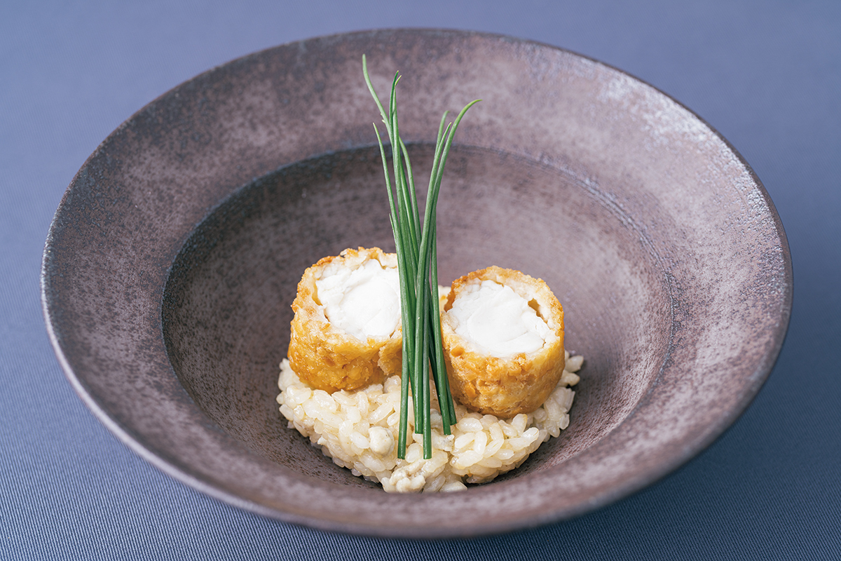 砕いたグリッシーニをまとわせたフリットはサクサクで、フグの旨みをギュッと閉じ込めている。酒米を使ったフグの身皮入りのリゾットはバター、チーズ、フグの出汁で炊き上げ、濃厚な味わい