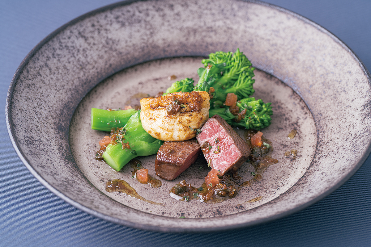メイン料理は白子のムニエルと牛フィレ肉。ハーブ水で蒸した山口生まれの野菜・はなっこりーを添え、アンチョビ、トマト、ハーブ入りの焦がしバターソースで味をまとめ上げている