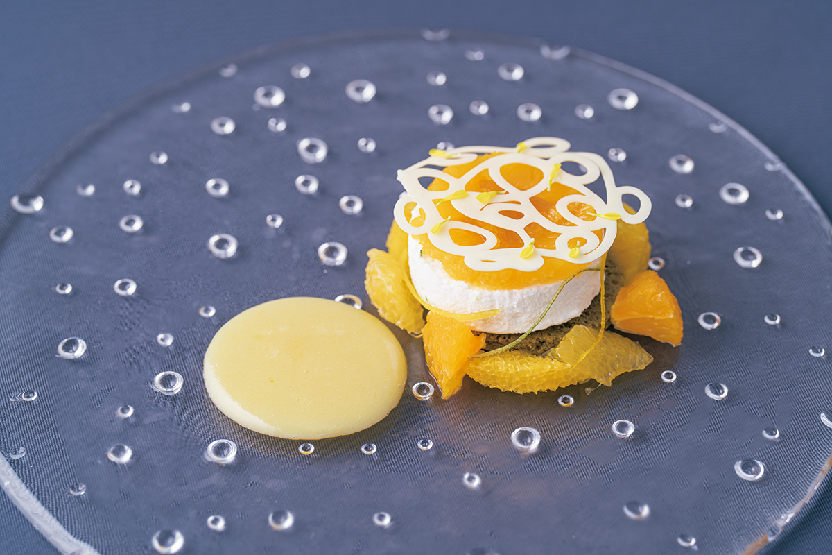 オレンジやタンカンなどの柑橘にハチミツの優しい風味のアイスケーキを挟み、温かいソースを合わせたデザート。ソースは長門ゆずきちとホワイトチョコレートを合わせた甘酸っぱい風味