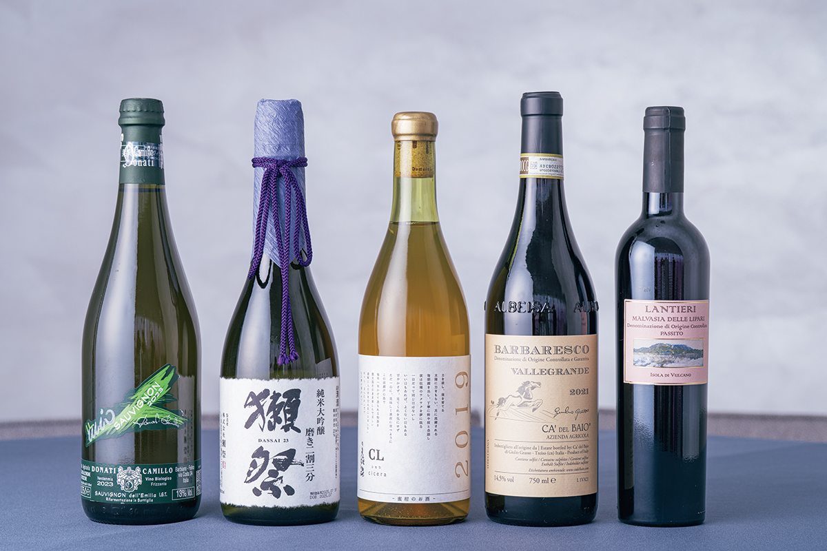 ペアリングは料理に合わせて7種類。イタリアのワインのほか、「獺祭」をはじめとした山口の日本酒、温州みかんで造った果実酒「シセラ」など、この地域ならではの酒が味わえる